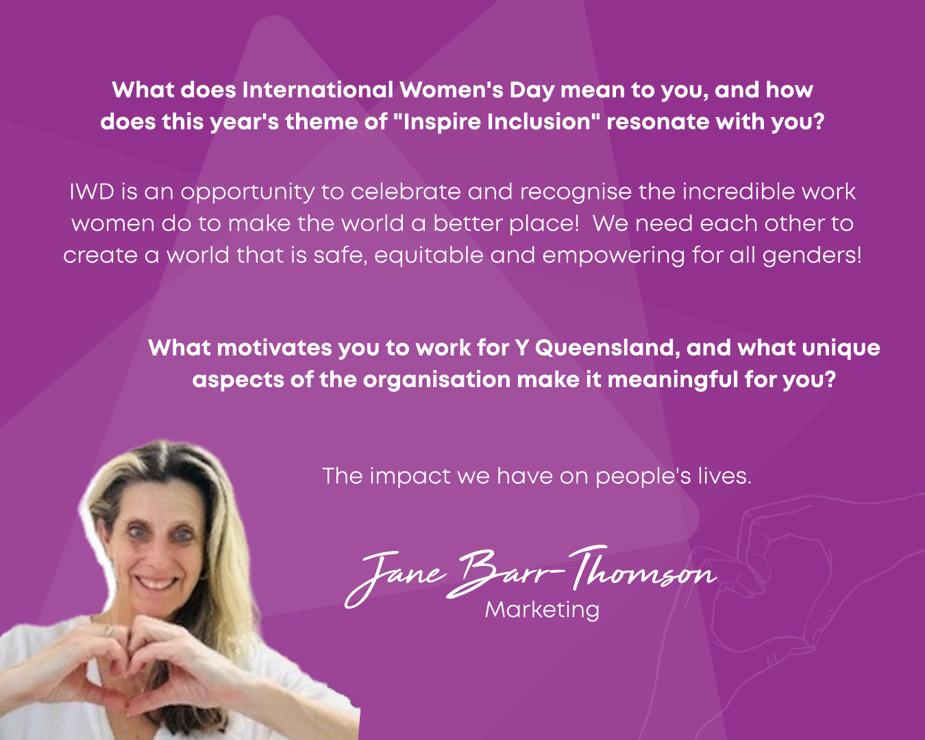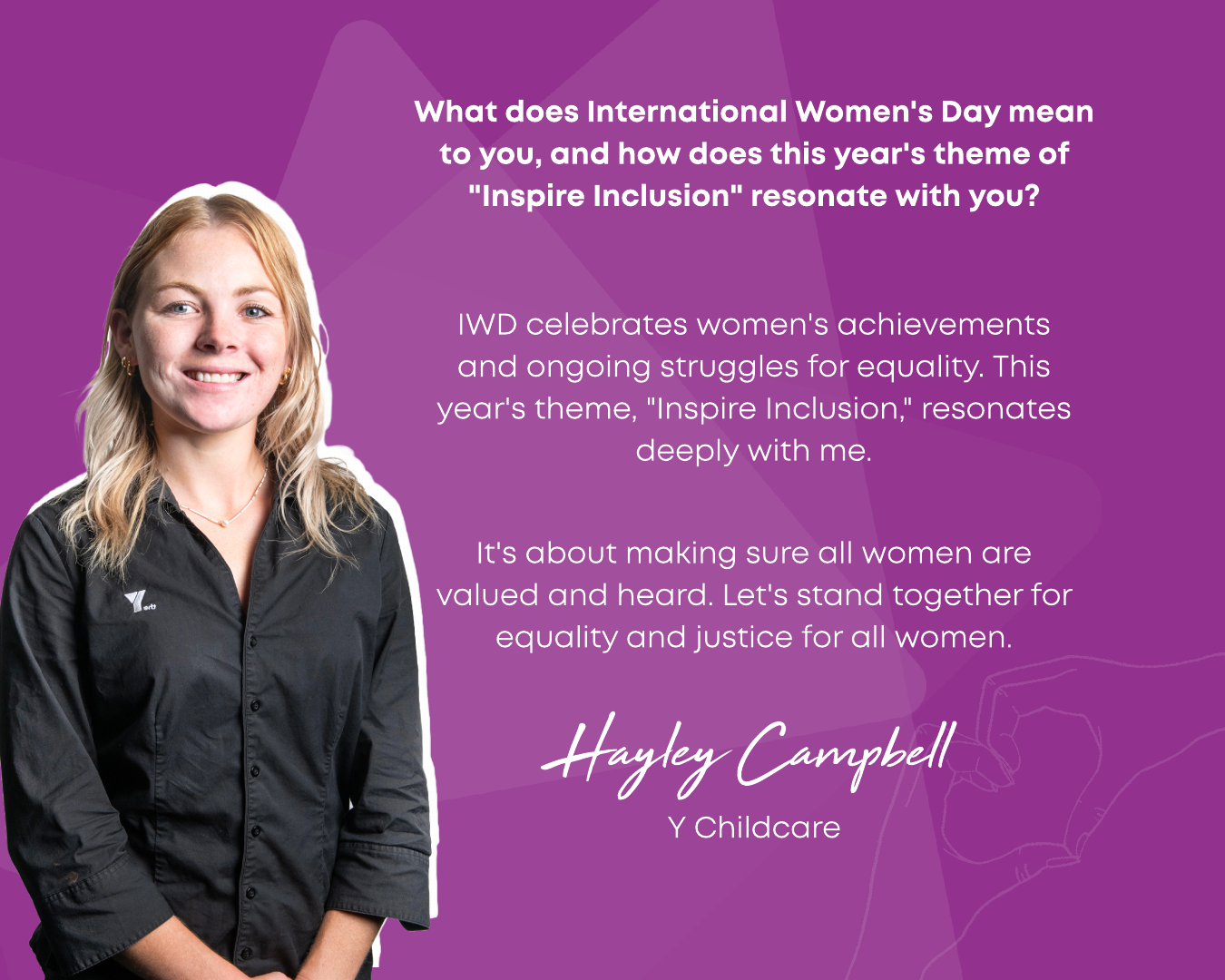 In 2024, Y Queensland celebrated IWD with the theme Inspire Inclusion, encouraging diversity, empowerment, and breaking barriers. As part of this, we launched Women & Their Y—a campaign inviting employees and volunteers to share their thoughts on what the theme meant to them. Their reflections highlighted the importance of fostering environments where all women—regardless of background, ability, or identity—are valued and supported.